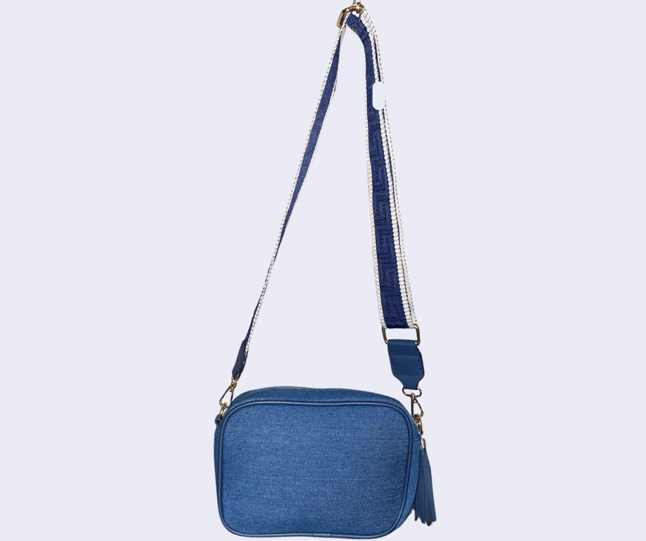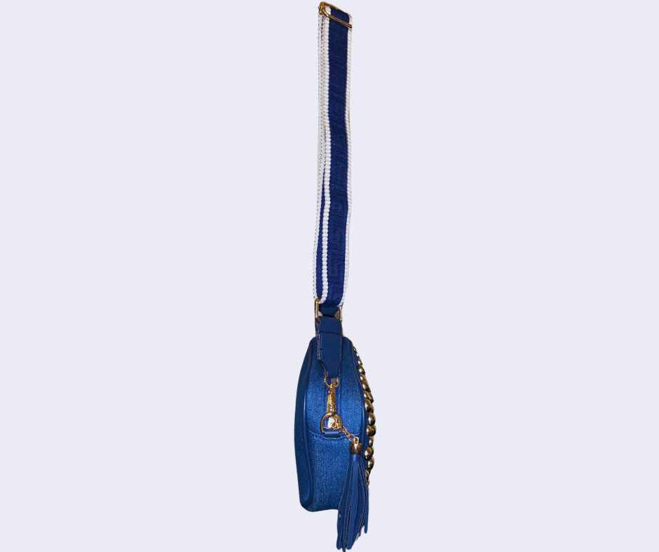 Borsetta da donna, tessuto color jeans, chiusura con zip, borchie dorate decorative, interno foderato in tessuto, tracolla con regolazione a scorrimento.