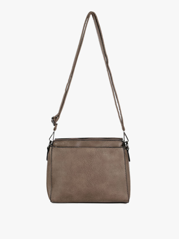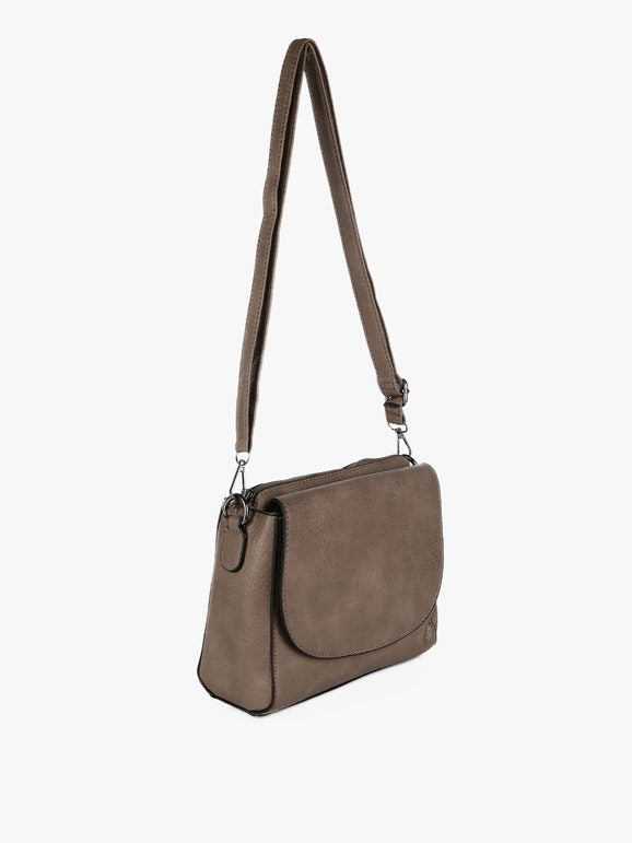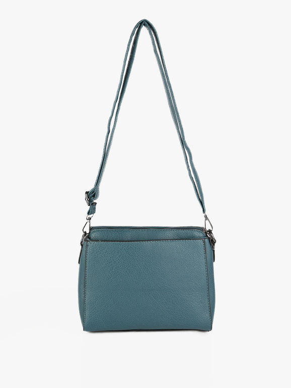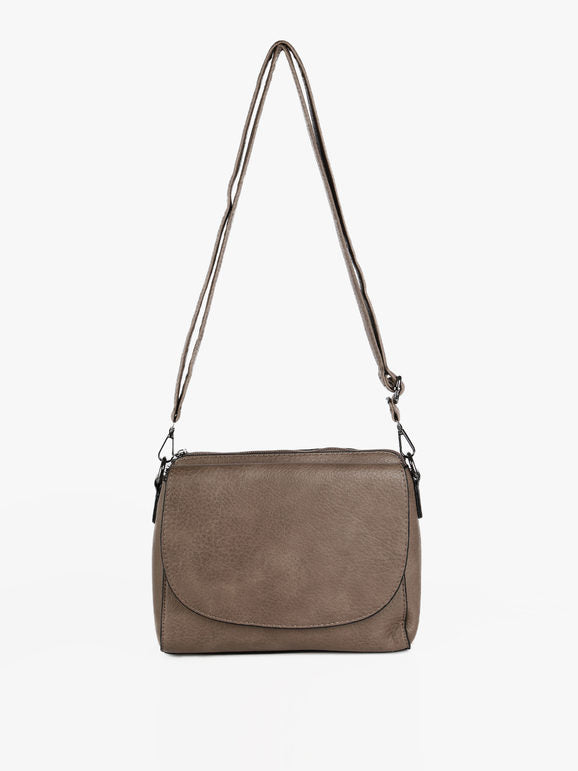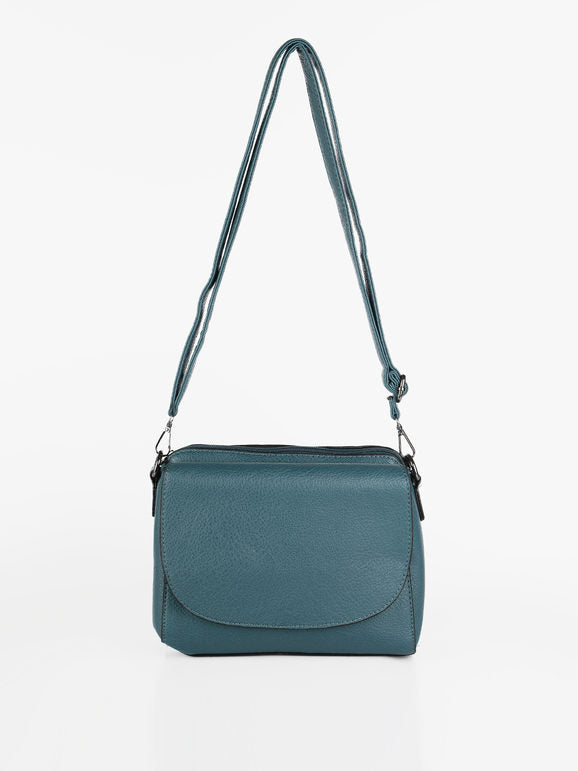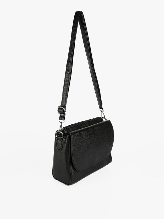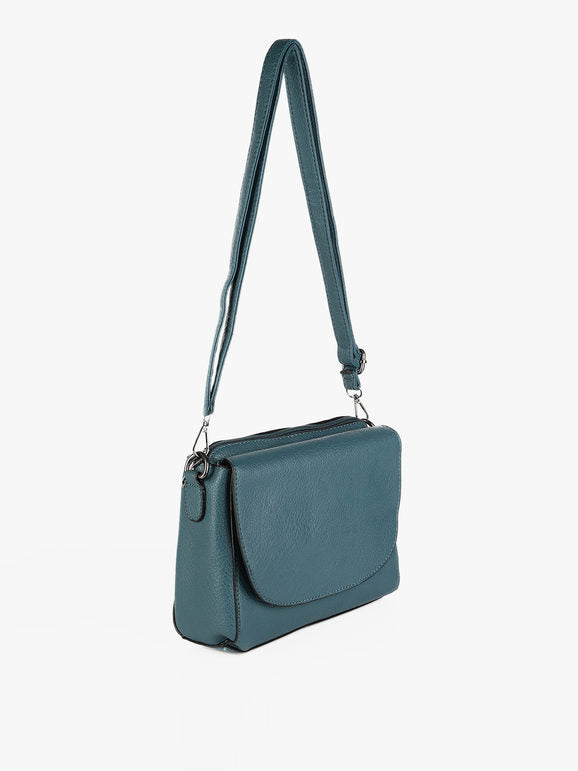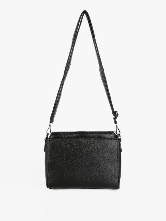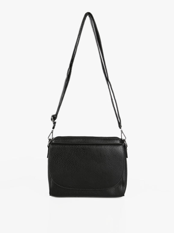 Tracolla donna con scocca in ecopelle, chiusura a battente con bottone a clip sul davanti, tasca principale con chiusura zip, interno foderato in tessuto con taschino interno, scomparto posteriore con chiusura zip, tracolla in dotazione regolabile e removibile tramite moschettone