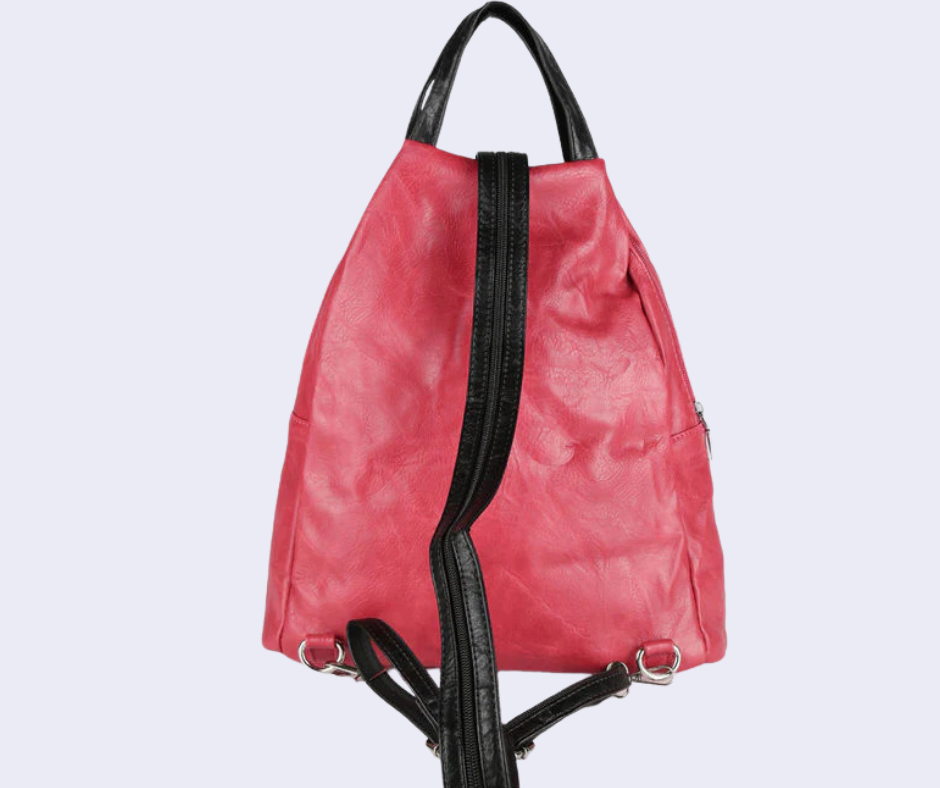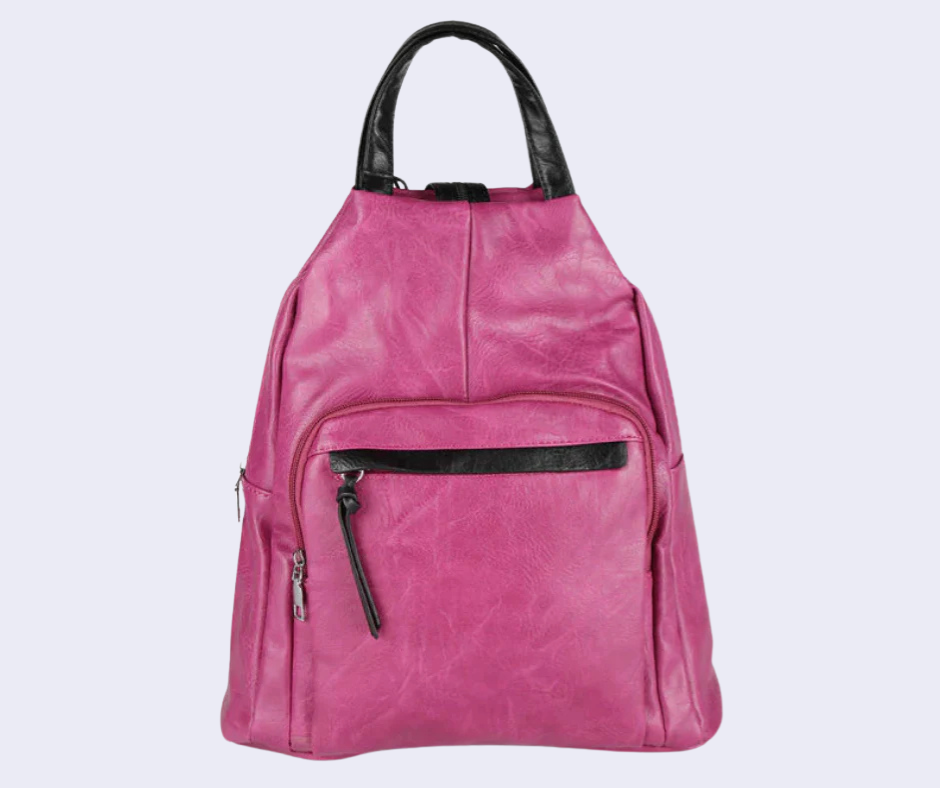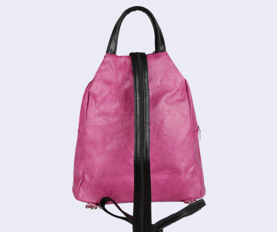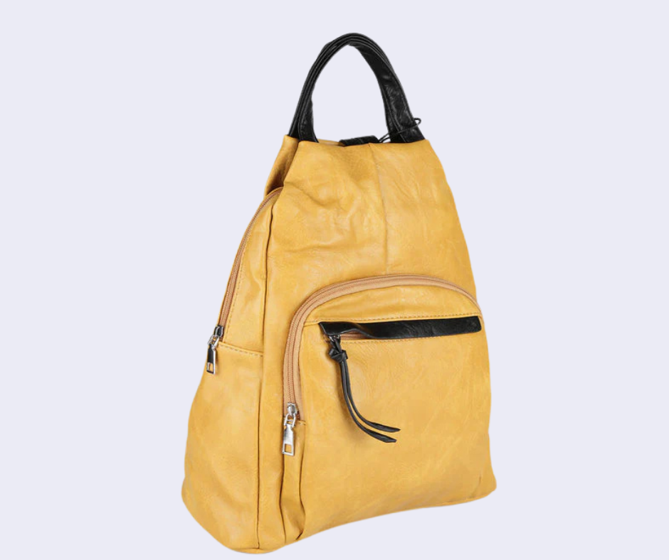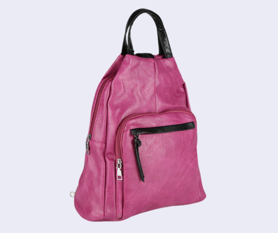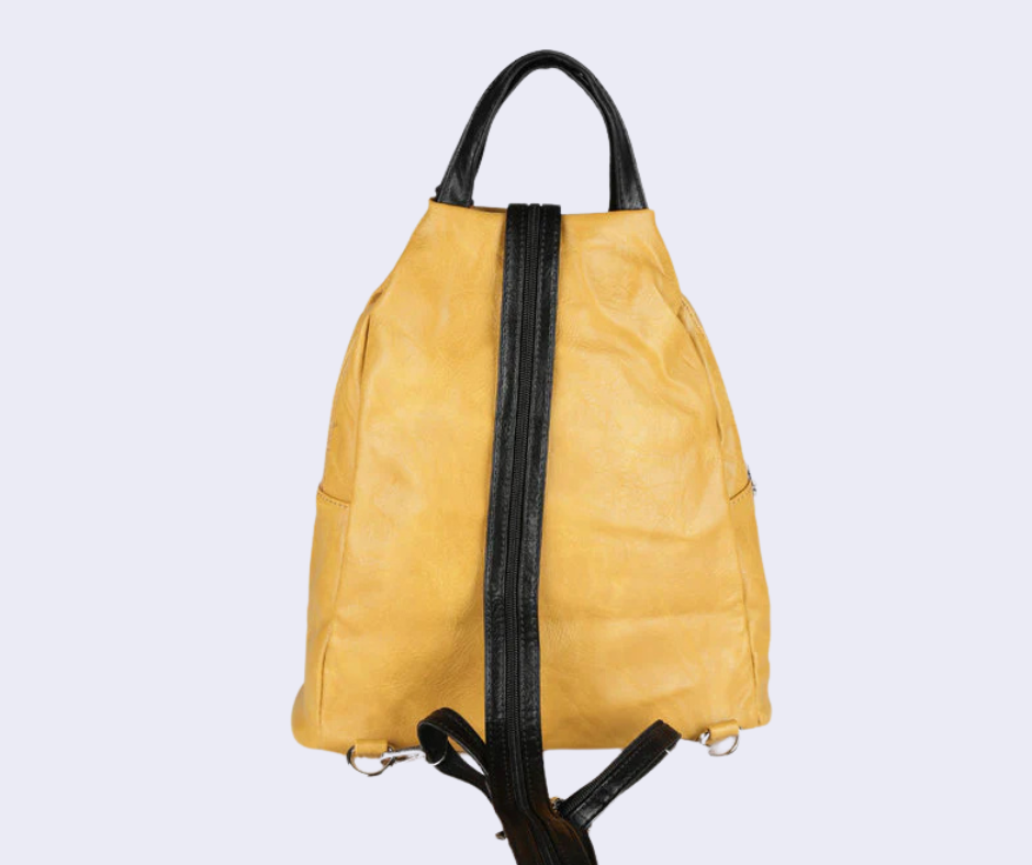 Zaino donna con scocca in ecopelle, tasca principale con chiusura zip, interno foderato in tessuto con taschini porta telefono e tasca extra con zip, 2 taschini esterni sul davanti con chiusura zip, manico su parte alta, spalline espandibili tramite zip con regolazione a scorrimento.